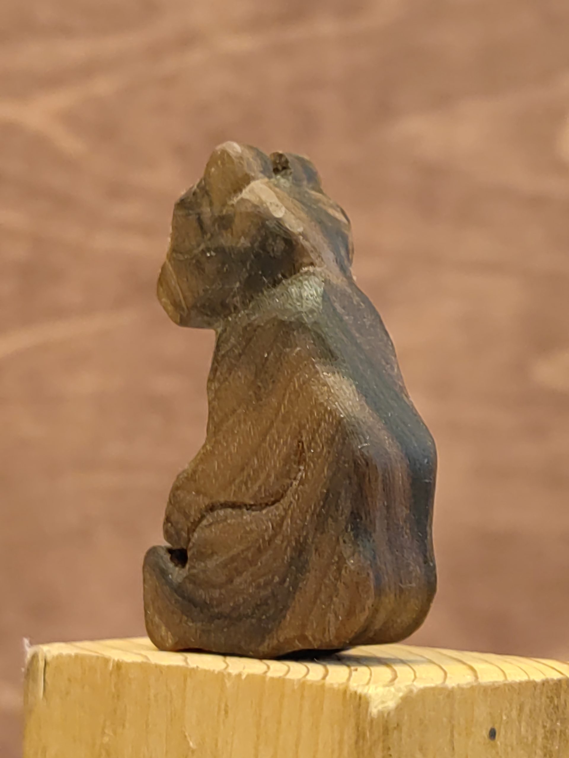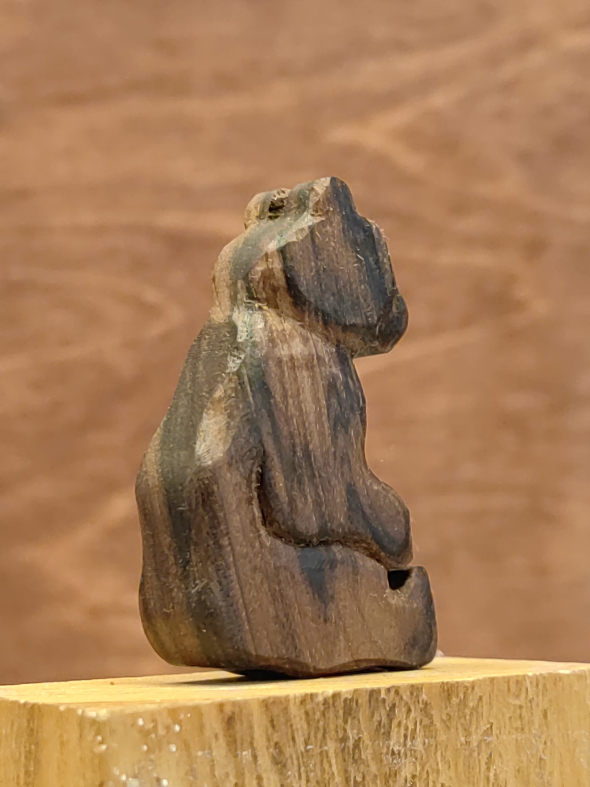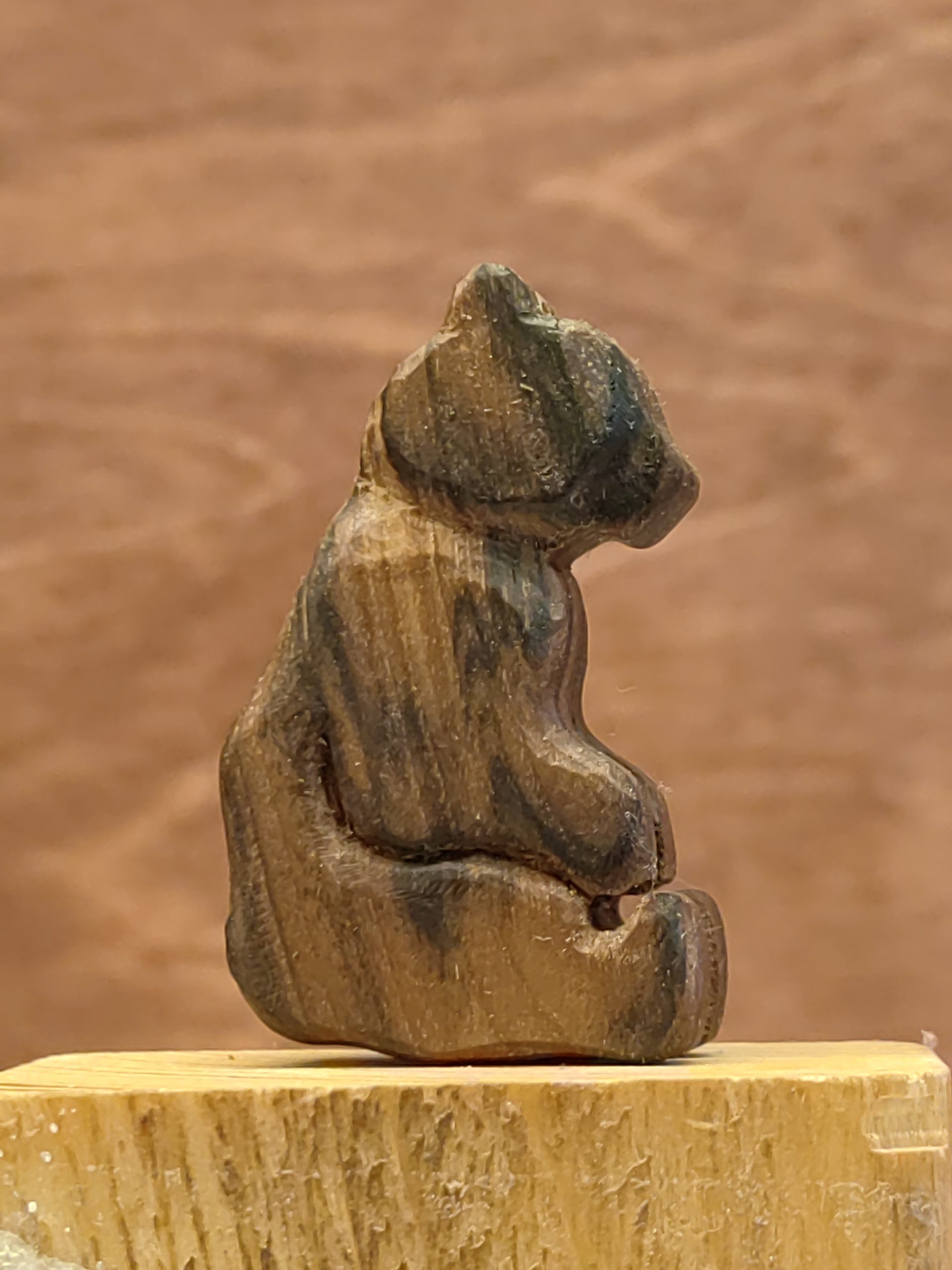 مجسمه ی چوبی خرس نشسته از جنس چوب گردو با رگه های خوشرنگ و زیبا
