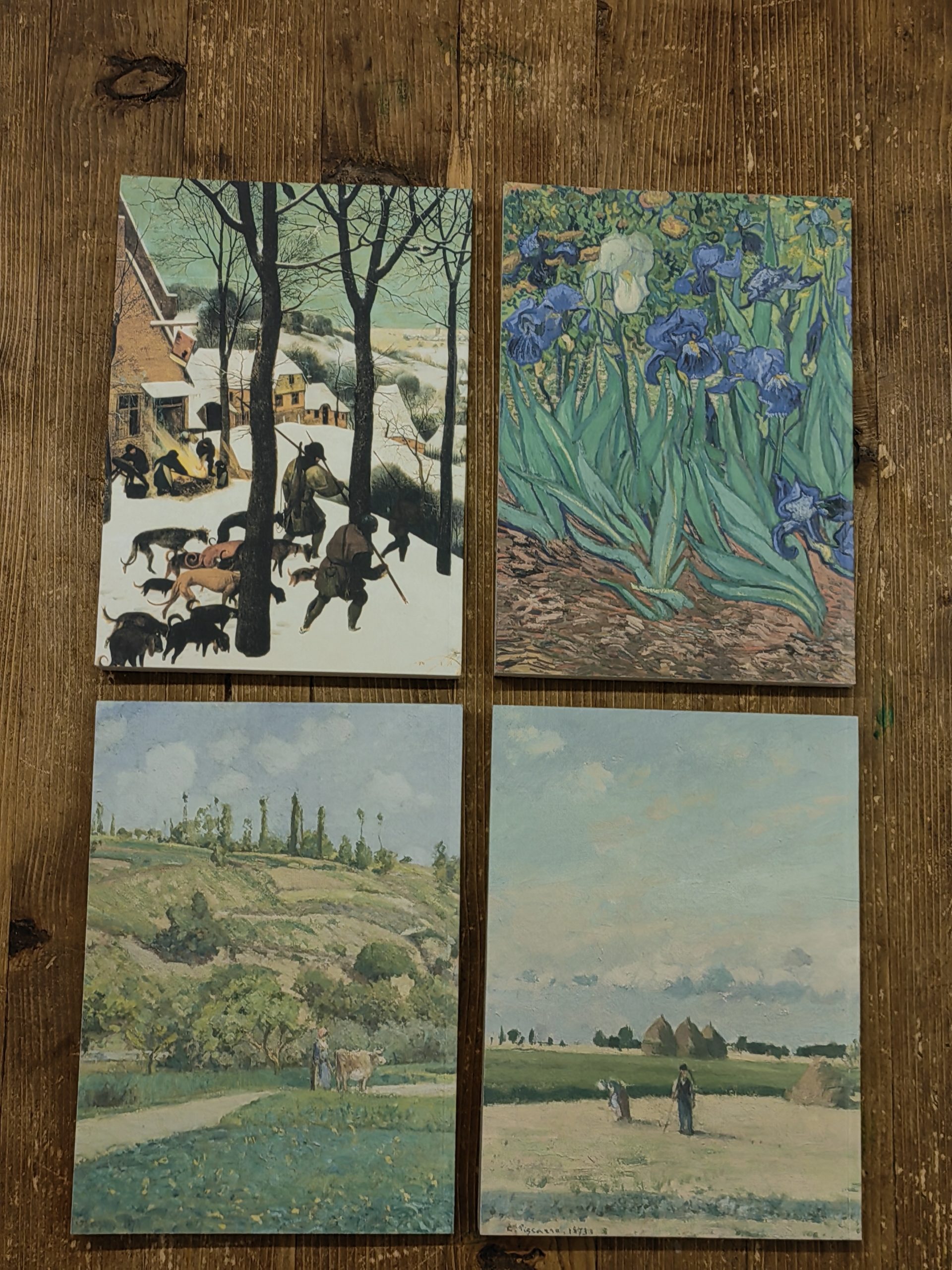 | نقاشی جهان طرح | گل های آبی از ونگوک, شکارچیان در برف الدر, مزرعه با گاو پیسارو, مزرعه پیسارو |